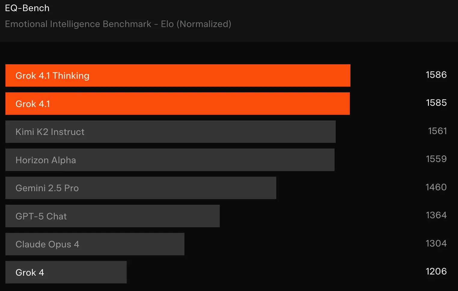 在“情感智能”評測(EQ-Bench3)中,Grok 4.1 表現出了更好的共情、理解、洞察與人際交互能力。