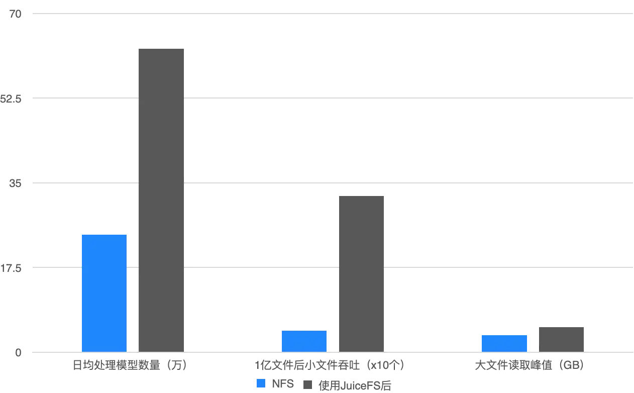 在使用 GlusterFS 時,我們每天最多隻能處理 20 萬個模型;而切換到 JuiceFS 後,處理能力大幅提升,日均數據處理能力增加了 2.5 倍,小文件吞吐能力也顯著提高,特別是在存儲量達到 70% 後,系統仍能保持穩定運行。此外,擴容也非常便捷,而之前的架構,擴容過程非常繁瑣,操作起來比較麻煩。