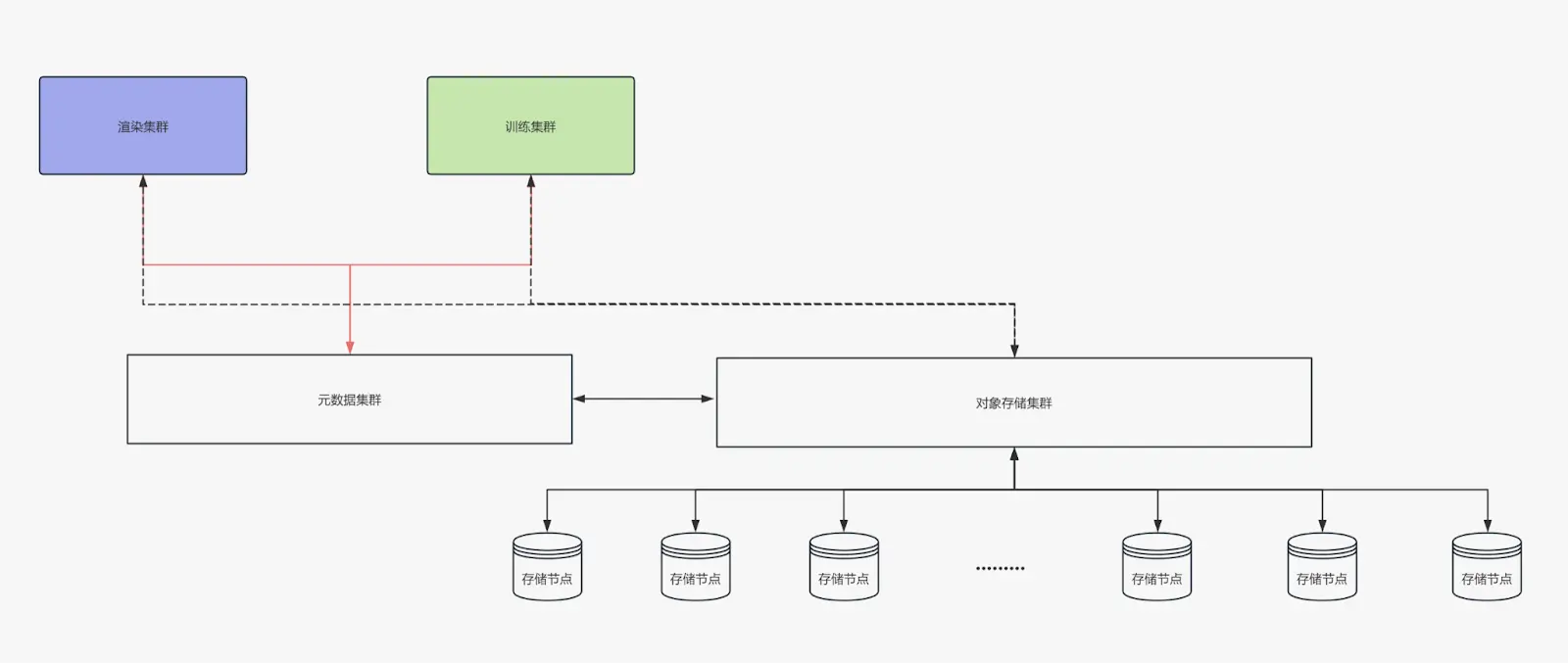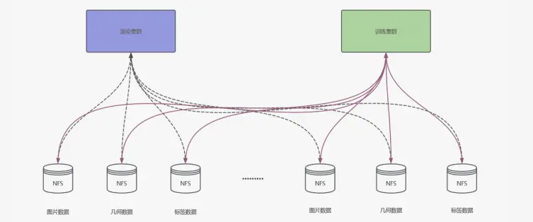 最初,我們採用了最簡單的方案------使用 NFS 進行掛載。然而,在實際操作中,我們發現訓練集羣和渲染集羣需要各自獨立的集羣來進行掛載操作。這種方式的維護非常繁瑣,尤其是當添加新的數據時,我們需要單獨為每個新數據寫入掛載點。到了數據量達到約 100 萬物體級別時,我們已經無法繼續維持這種方案,因此在早期階段,我們就放棄了這一方案。