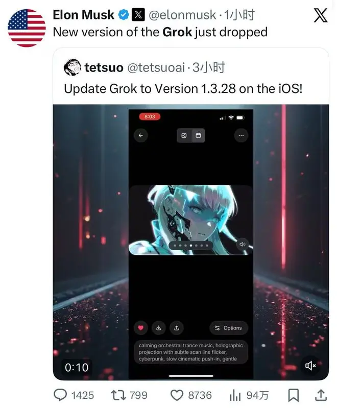 馬斯克在社交平台X上表示,Grok的新版本已發佈,用户可在iOS上將Grok更新至1.3.28版本。 此外,馬斯克當日多在社交平台上發帖稱,Grok現已在多個國家/地區的 App Store 排行榜上榮登榜首。使用Grok Imagine,即可將老照片瞬間轉換成視頻。 據馬斯克當日轉發另一條視頻透露,Grok目前在全球擁有超過3000萬月活躍用户。