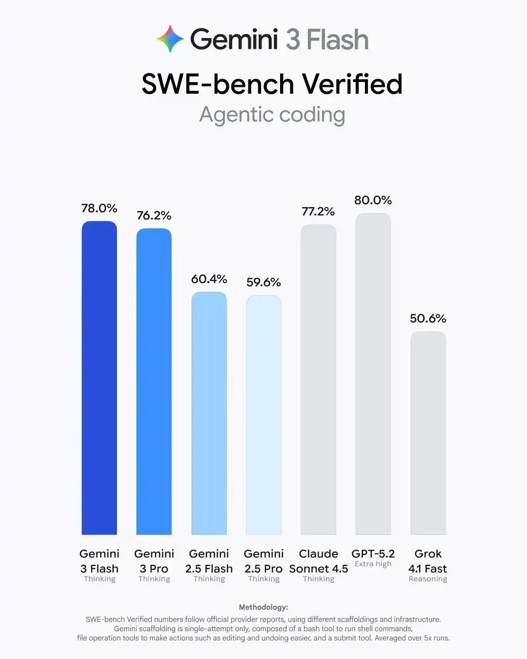 在 SWE-bench Verified 基準測試中,Gemini 3 Flash 的解決率達到 78%,僅次於 GPT-5.2 的 80%,不僅超越 Gemini 2.5 系列,甚至優於同門的 Gemini 3 Pro,Pro 的準確率為 76.2%。