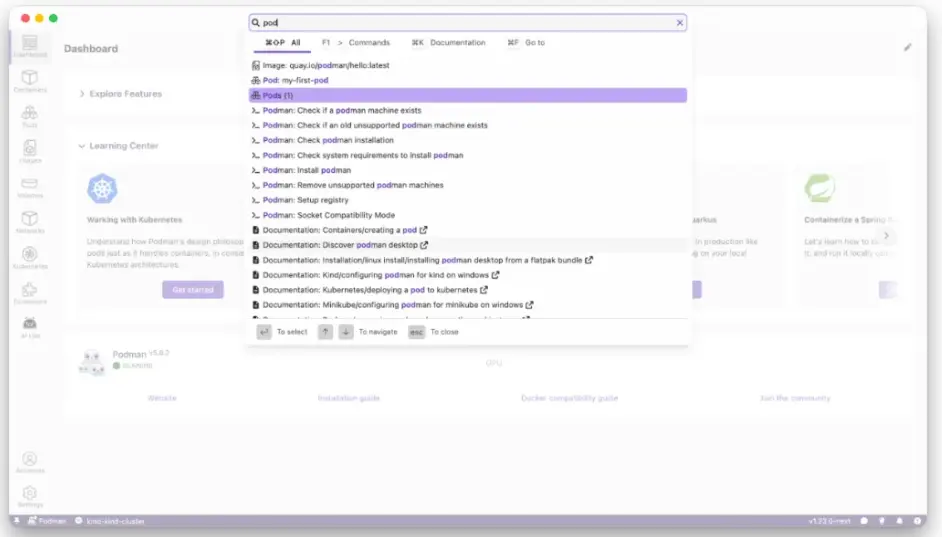 搜索欄加入了算法高亮、快速跳轉應用各部分的功能,並支持直接搜索 Podman 資源(容器、鏡像、pod、卷)。現在搜索欄提供類似命令面板的體驗,方便快速導航。