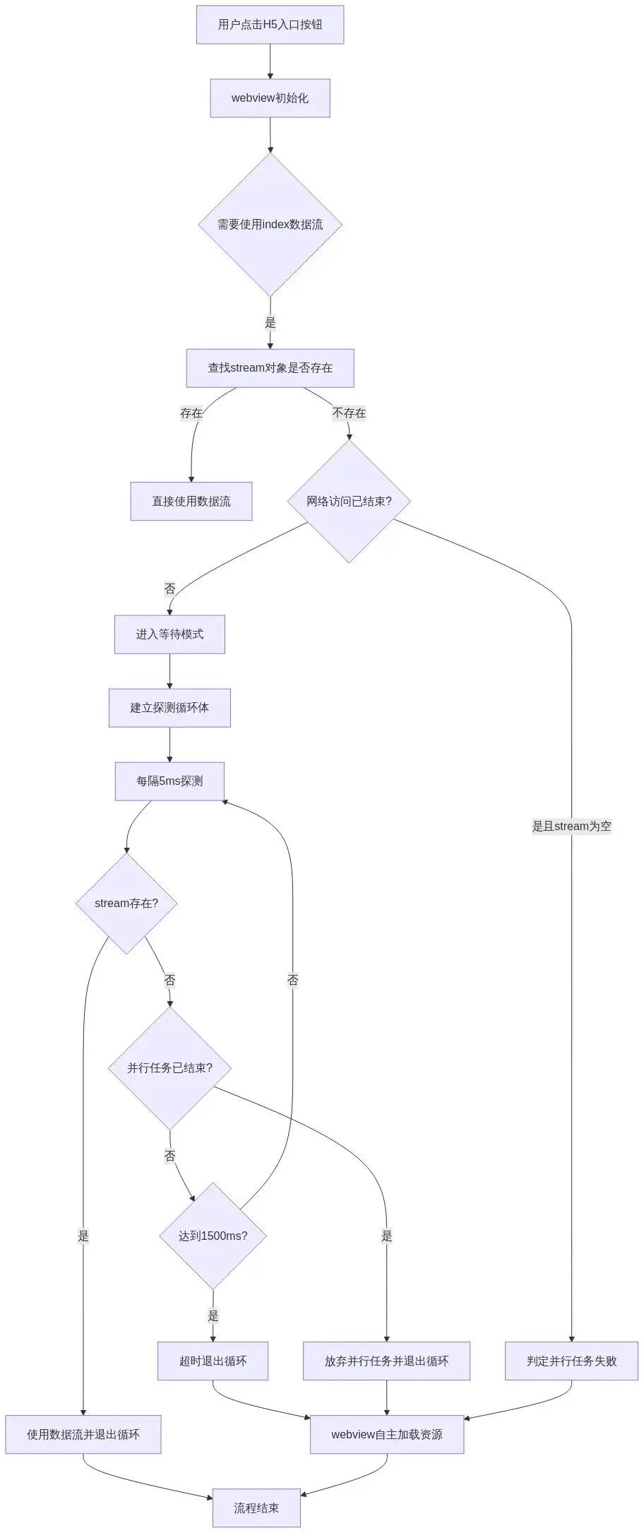用户點擊H5入口按鈕,並行index任務發起,訪問網絡開始建聯,一但完成有效建聯,則保存網絡stream對象,當webview需要使用該數據流的時候,判定stream對象是否存在,如果存在,則直接使用該數據流,如果stream對象不存在,則判定網絡訪問是否返回,如果是因為網絡訪問失敗導致stream為空,則認為是並行任務失敗,否則會進入等待模式,等待模式下,線程建立一個循環體,每隔5ms,探測一次stream是否存在,網絡是否已完成建聯,一但探測到結果,則退出循環體,即使多次沒有探測到結果,1500ms後依然退出循環體,此時放棄並行任務數據,改為webview自主加載資源。