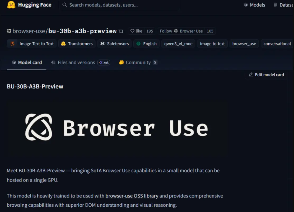 知名開源瀏覽器自動化項目 BrowserUse 發佈了其首個自研大語言模型——BU-30B-A3B-Preview。