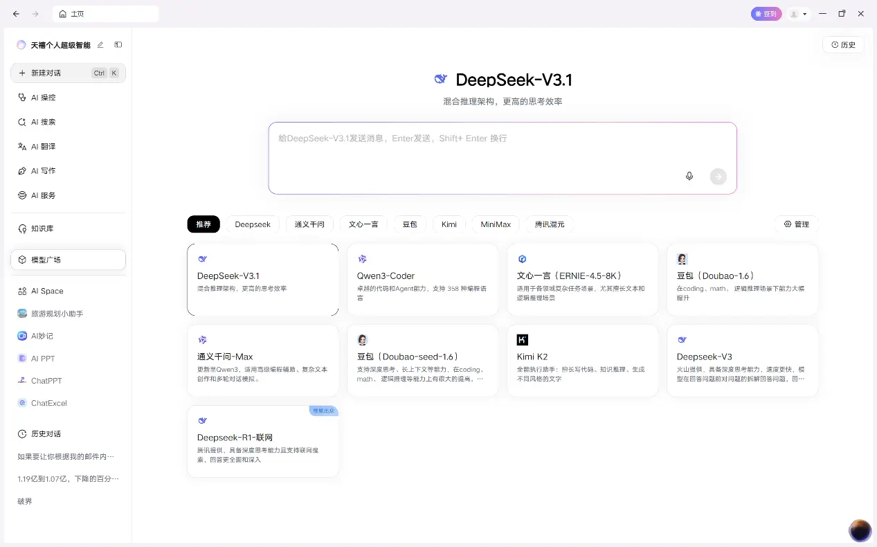 當然,以上還只是智能體萬千應用場景中的一小部分。天禧個人智能體3.5版提供了AI操控、AI搜索、AI翻譯、AI寫作、AI服務、知識庫、模型廣場和AI Space等眾多功能大項,而每個大項中又包含眾多專業智能體,組合串聯之後便能得到幾乎無限的應用場景。這種海量能力的任意組合正是天禧個人智能體3.5版對於用户的核心價值所在。