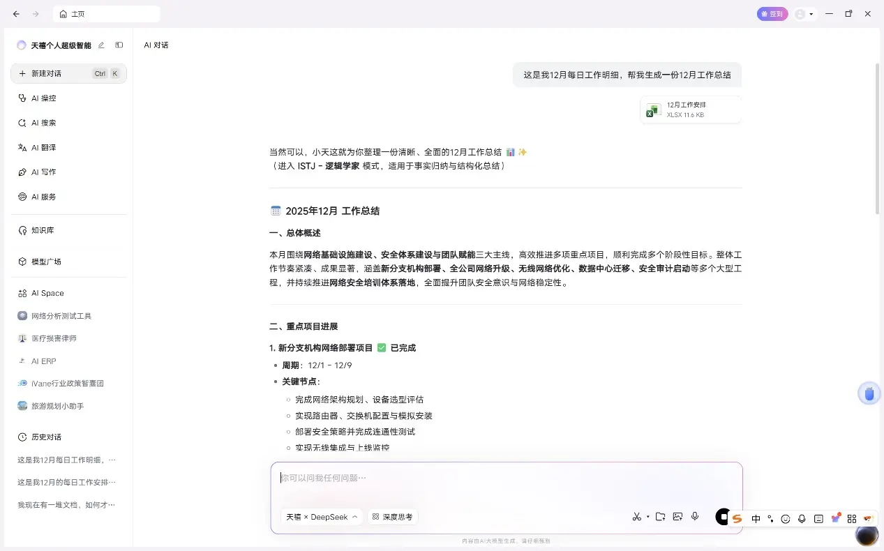 無論是身處辦公室的白領,還是忙碌在一線的藍領,每週每月每季度的工作彙報總是少不了。而在工作內容越來越多元化、更強調跨界的當下,想要有條理的總結工作卻變得比以往更困難了。但這對於擁有文檔學習分析能力的天禧個人智能體3.5版來説,卻是個幾分鐘就能搞定的簡單任務。