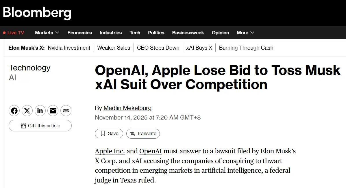 這場訴訟涉及對智能手機市場和生成式 AI 聊天機器人市場的壟斷指控,馬斯克的 X 公司與其創辦的 AI 初創公司 xAI 認為,兩家公司共謀通過不正當手段排擠競爭對手。