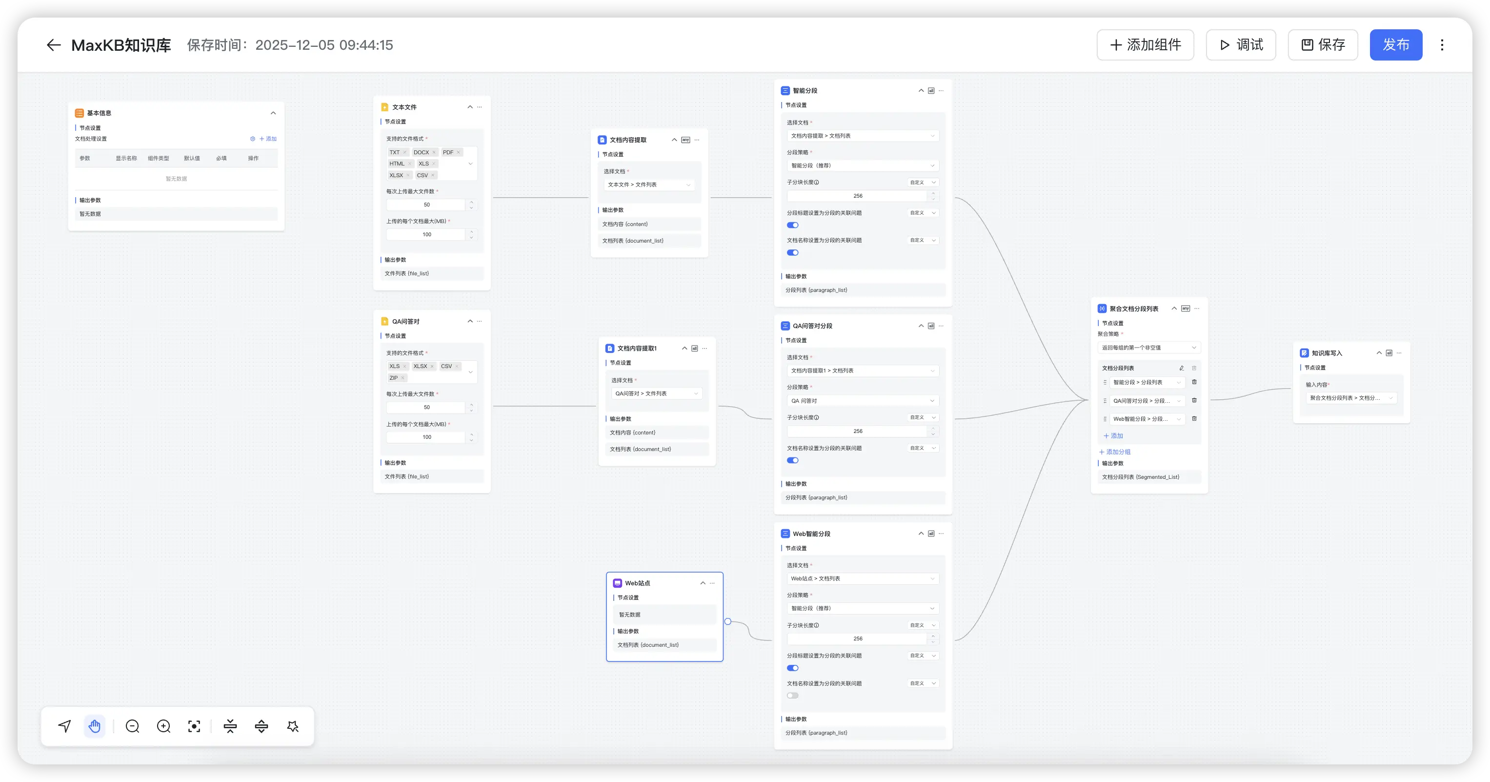MaxKB v2.4.0 社區版新增工作流知識庫功能,允許用户通過拖拽節點的方式自主編排從不同數據源導入到知識庫寫入的全流程,滿足企業個性化知識管理需求。工作流知識庫的使用步驟為:創建工作流知識庫→編排工作流→調試併發布工作流→導入文檔。以下是每個步驟的詳細介紹: