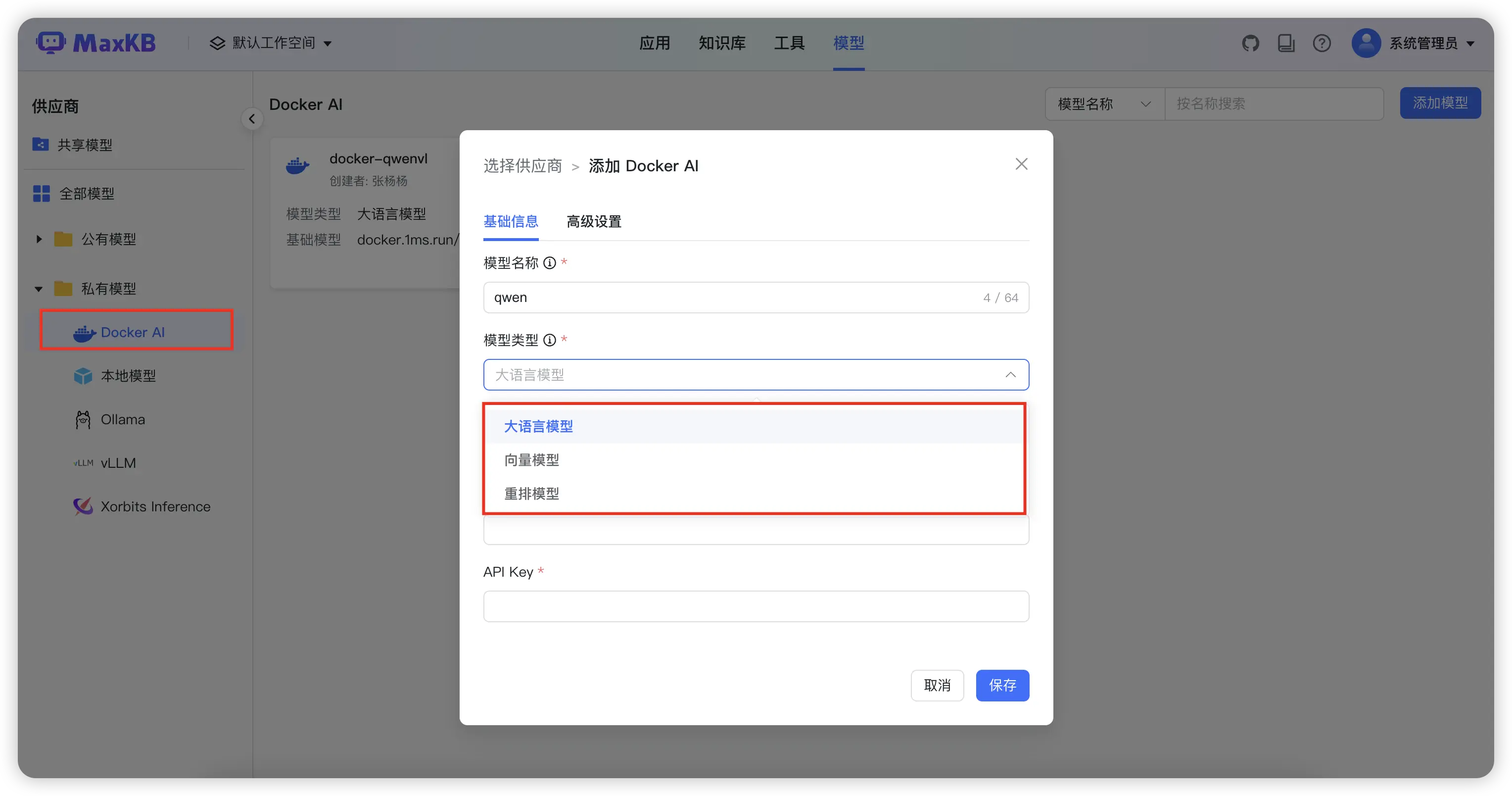 在 MaxKB v2.4.0 社區版中,新增支持 Docker AI 供應商的大語言模型、向量模型和重排模型,進一步豐富了模型集成生態,為模型管理提供了更大的靈活性和選擇空間。