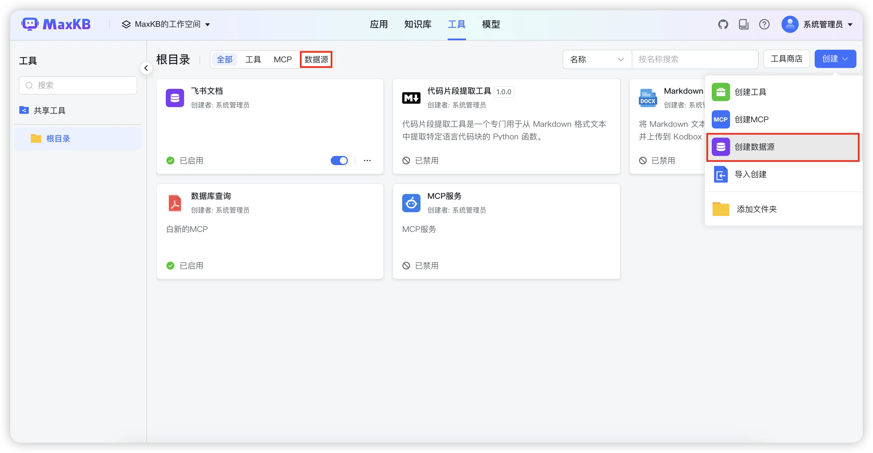 在 MaxKB v2.4.0 社區版中,新增數據源工具支持,用户只需要按照規範開發數據源工具並啓用,即可將其接入工作流知識庫,打破了以往依賴官方新增知識庫類型的限制,拓寬了 MaxKB 的知識庫接入能力。