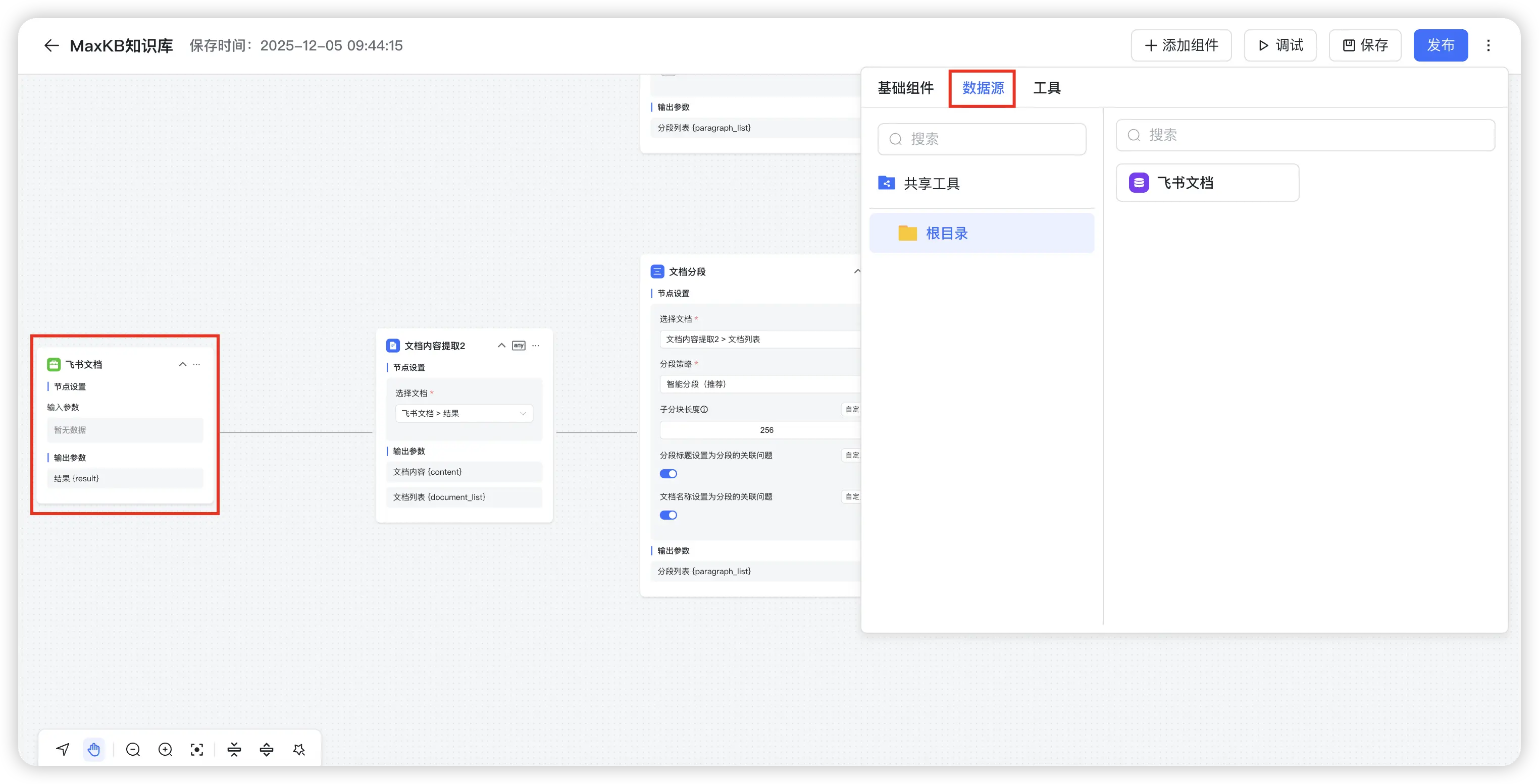 數據源:作為工作流的起始節點,支持 “內置 + 工具擴展” 雙模式,系統默認支持本地文件與 Web 站點兩類數據源,支持通過數據源工具接入其他企業級數據源(例如企業微信文檔、釘釘文檔等,現已支持飛書數據源工具),用户只需按照規範開發數據源工具,即可接入工作流,無需等待系統版本更新。