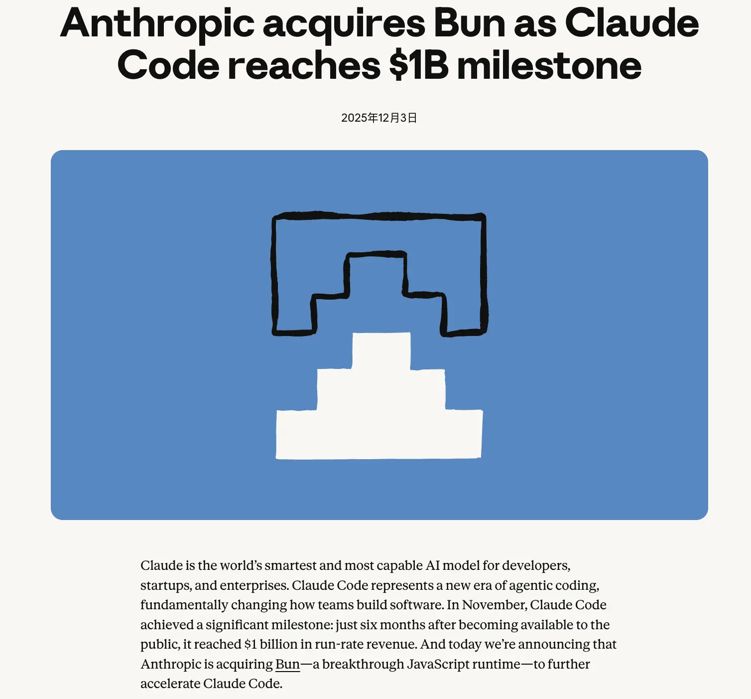 此次收購旨在通過結合 Bun 的高性能工具鏈與 Claude Code 的AI編碼能力,加速下一代軟件基礎設施的建設。同時,Claude Code 在發佈六個月後,其年化運營收入已達到 10億美元。