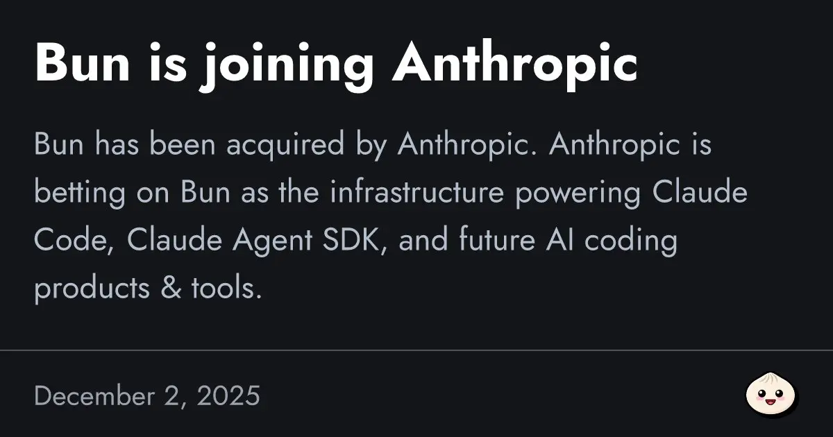 Anthropic 宣佈收購 JavaScript 運行時 Bun,後者將成為 Claude Code、Claude Agent SDK 及未來AI編碼產品的底層基礎設施。收購後,Bun 將繼續保持開源和 MIT 許可,原有團隊不變,並持續公開開發。