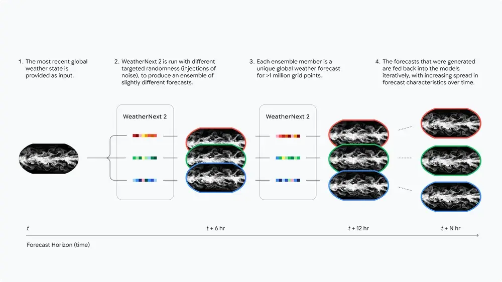 WeatherNext 2 已集成至 Google Search、Gemini、Pixel Weather 及 Maps Platform 的 Weather API,並將在未來數週內支持 Google Maps。其數據現已開放於 Earth Engine 和 BigQuery,並通過 Vertex AI 提供早期訪問計劃,供用户進行自定義推理。