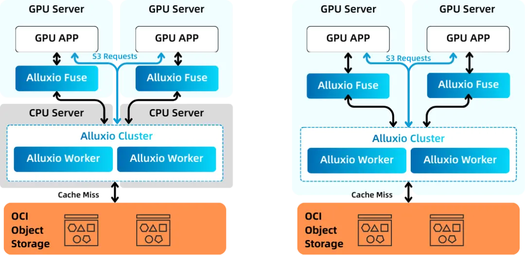 - 混合模式(Co-located mode):Alluxio 運行在 GPU 服務器上,使用閒置的 NVMe 硬盤,無需新增硬件。這種模式經濟高效,非常適合小型集羣或單租户工作負載。由於 Alluxio 服務和運行在同一節點上的用户應用程序共享 CPU 和緩存資源,其性能可能略低於獨立模式。