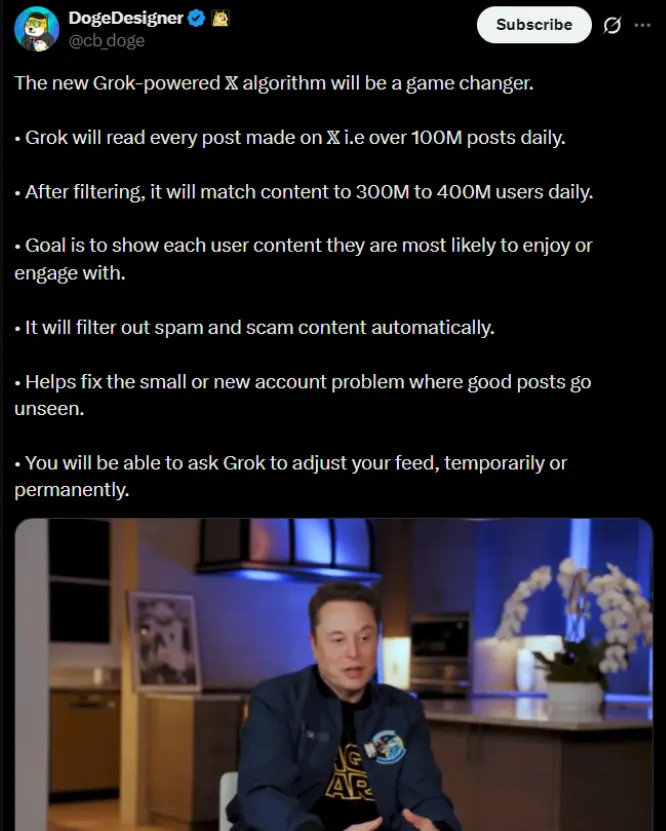 新算法的核心在於Grok的強大處理能力:平台每日產生超過1億條原創帖子、回覆及轉發內容,Grok將實時分析全部帖子(包括文本、圖像和視頻),通過深度理解內容本質,進行智能篩選和匹配。