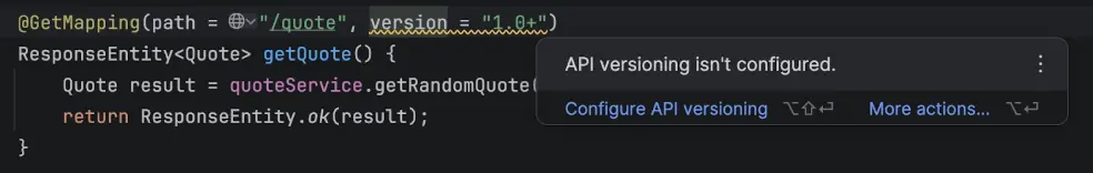 IntelliJ IDEA 會自動檢測版本控制。IDE 會檢查你的應用是否配置了版本控制,識別你使用的是屬性還是ApiVersionConfigurer類,如果出現問題還會發出警告。如果你忘記啓用版本控制,IDE 不僅會指出問題所在,還會告訴你如何修復。