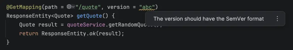 可以在@GetMapping註解中的版本號上按住 Ctrl 鍵點擊,直接跳轉至配置代碼。IDE 還會檢查你的版本值是否遵循標準的 SemVer 規則。
