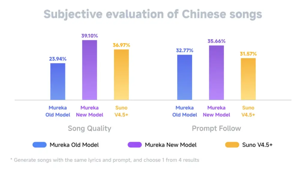 Mureka全新模型以“性能、速度、穩定性”為核心優化方向,性能升級包括: