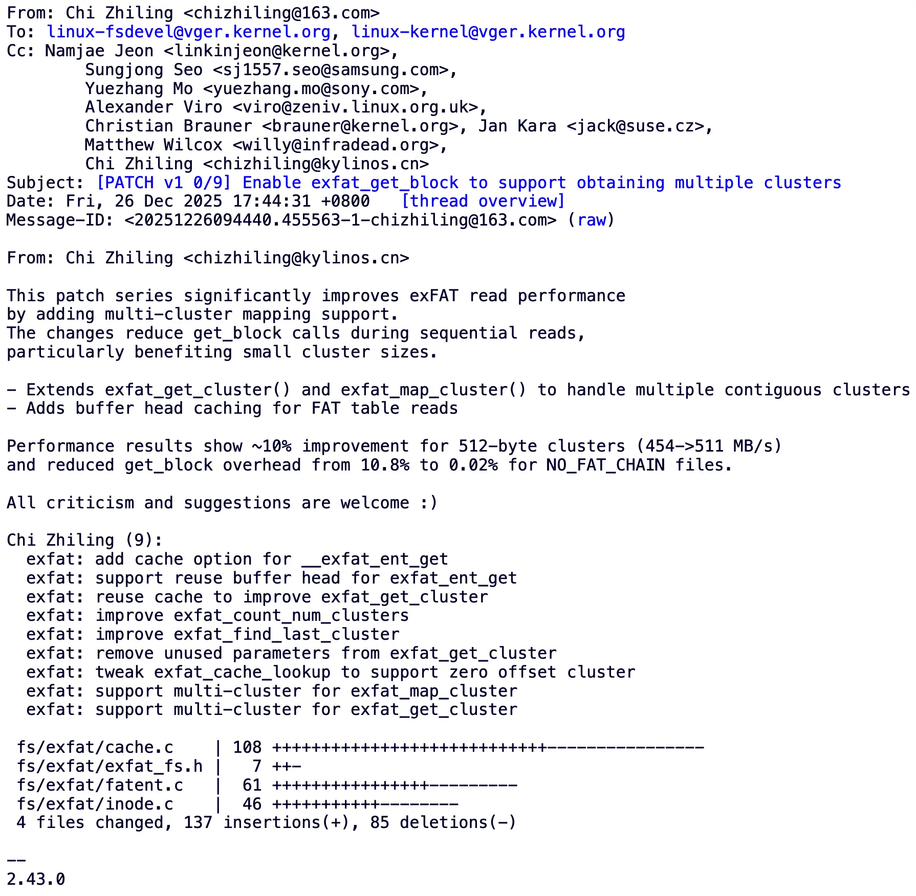 不過在傳統實現中,讀取操作需要大量單獨的聚簇查找調用(get_block),當簇尺寸較小時這會成為性能瓶頸。由 Kylin OS 貢獻者 Chi Zhiling 發佈的補丁組,為 Linux 內核中的 exFAT 驅動添加了 多簇映射支持。這一機制允許在一次映射操作中獲取多個簇的位置信息,從而: