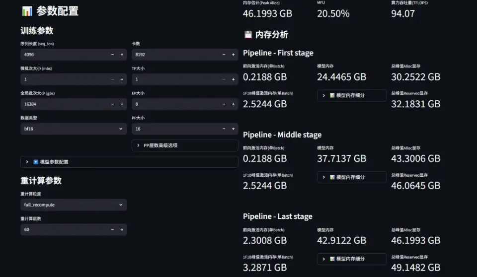 SimuMax v1.1引入了直觀的可視化配置界面。用户通過簡單交互,即可快速完成從單卡到萬卡集羣的訓練任務定義,極大簡化工作流,使工程師更專注於訓練策略設計與深層性能優化,提升模型研發與調優效率。