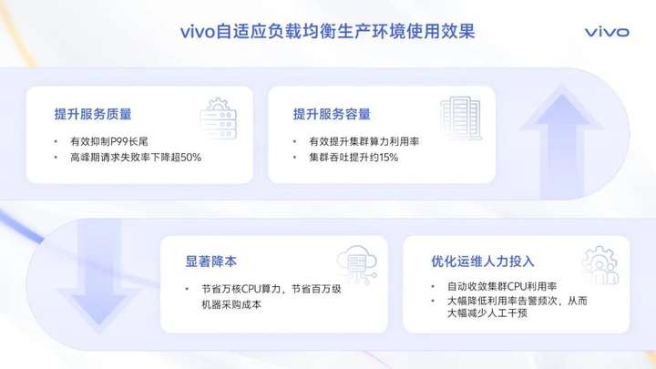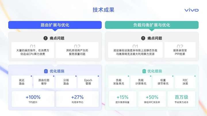 右側呈現了原始策略與vivo版自適應策略,相對隨機策略在多項核心指標上的表現,包括TPS、平均RT等,可看出此次優化效果顯著,各項指標均有大幅提升。