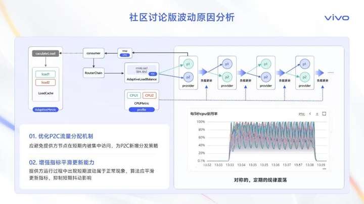 在負載均衡方面: 我們原先面臨着原靜態策略難以適配底層設施差異,導致算力利用率低的問題。為此,我們基於社區版本構建了vivo自適應負載均衡能力,重點優化P2C算法並引入權重計算單元,實現流量自適應與平滑調度,最終顯著提升服務容量與質量,同時實現降本和節約人力的目標。
