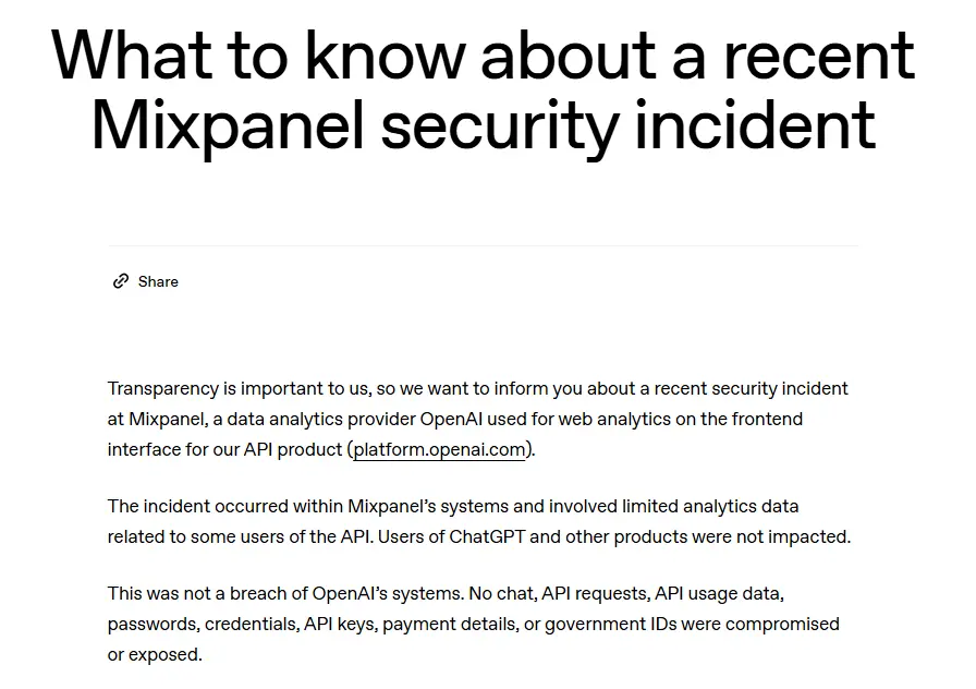 OpenAI 就網站分析服務 Mixpanel 安全事件發佈公告稱,2025 年11 月 9 日,Mixpanel 發現有攻擊者未經授權訪問了其部分系統,並導出了一個包含有限客户身份信息和分析信息的數據集。Mixpanel 通知 OpenAI 正在進行調查,並於 2025 年 11 月 25 日與其分享了受影響的數據集。