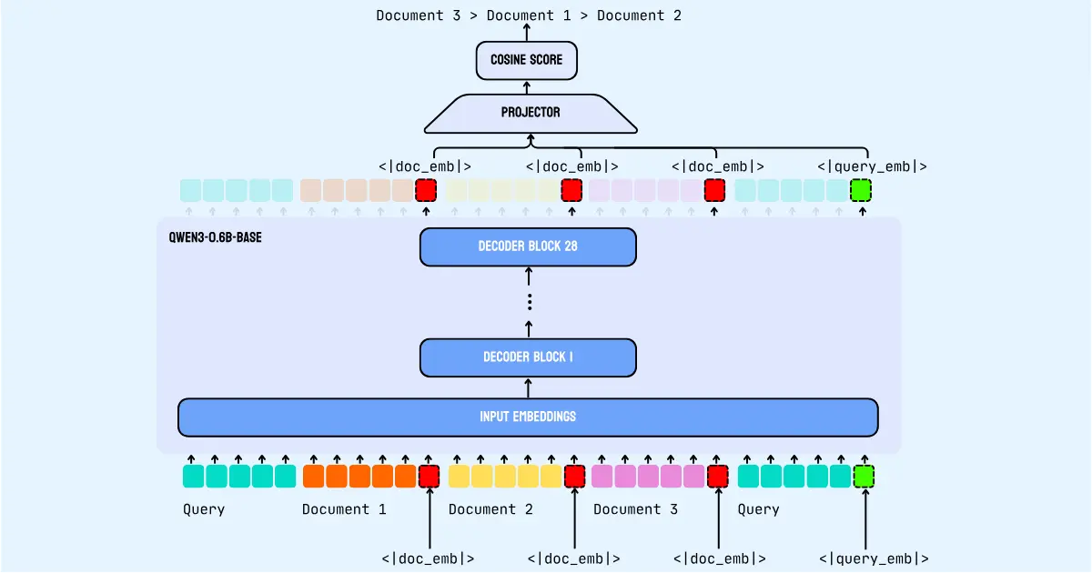 jina-reranker-v3 構建在 Qwen3-0.6B backbone 上,這是一個僅 decoder 的 transformer 模型,帶有 causal self-attention。該模型同時處理多個 documents 和 query,在指定的 token 位置提取 contextual embeddings,以實現高效的相似度計算。