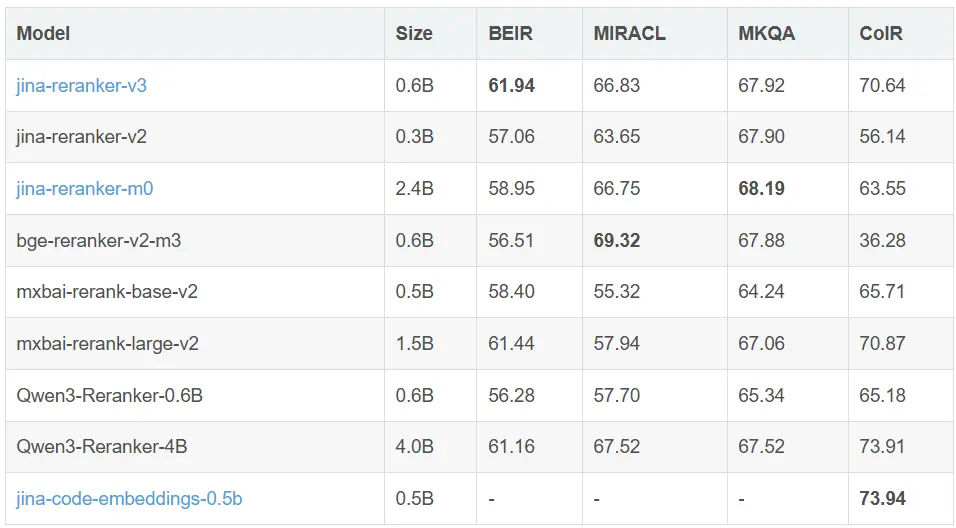 在實際應用中,我們關心的是最頂部的結果,這種行為完全可以接受。我們的評估顯示jina-reranker-v3的性能優於早期版本,包括jina-reranker-v2-base-multilingual和jina-colbert-v2,以及更大的替代模型如 Qwen3-Reranker-4B 和jina-reranker-m0,進一步證實了這一點。