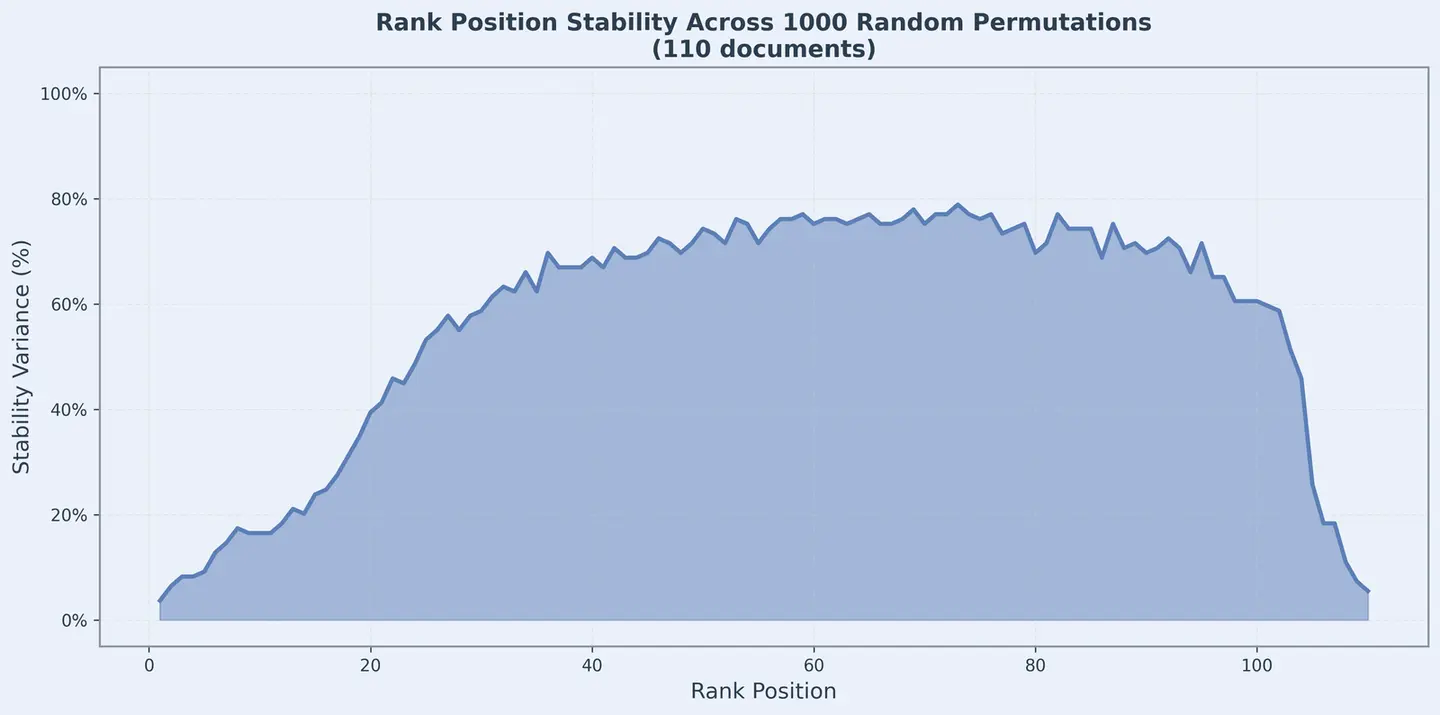 關鍵發現是,排名靠前的位置表現出極好的穩定性。排名 1-10 的方差最小,最相關的 documents 無論輸入順序如何,都能穩定排在頂部。這對於 nDCG@10 和類似的 top-k 指標至關重要。無關的 documents 一直排在底部,清晰區分了相關內容和無關內容。