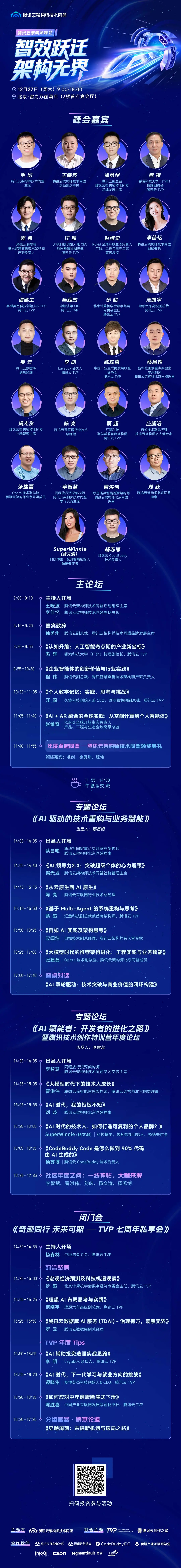 12 月 27 日,由騰訊雲架構師技術同盟與騰訊雲 TVP 聯合主辦的「智效躍遷,架構無界」騰訊雲架構師峯會將在北京·富力萬麗酒店盛大啓幕。本次峯會致力於在歲末年初,為技術管理者與資深架構師校準 AI 時代的產業新座標。