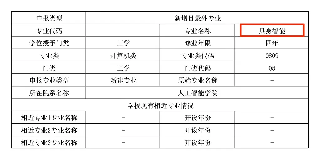 預計就業人數 5 人,華為聯合培養 2 人,國家地方共建人形機器人創新中心 3 人。該專業將融合人工智能、機械動力、計算機科學與技術等多學科前沿知識,旨在培養跨“感知-決策-控制-本體設計”的複合型創新人才,填補現有教育體系相關人才缺口。