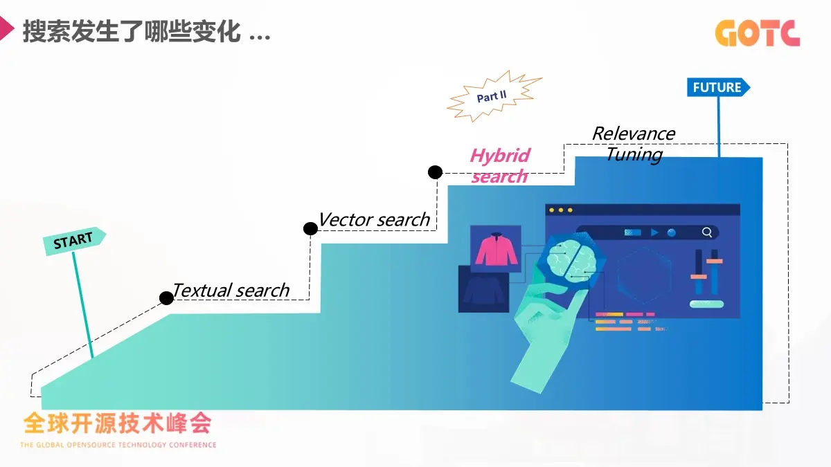 Elastic 中國首席佈道師劉曉國在 GOTC 2025 全球開源技術峯會的演講提到了一個更實際的問題:在現有技術棧中,如何用向量搜索、混合搜索、RAG 和 Agentic 技術,構建面向未來的搜索體驗。
