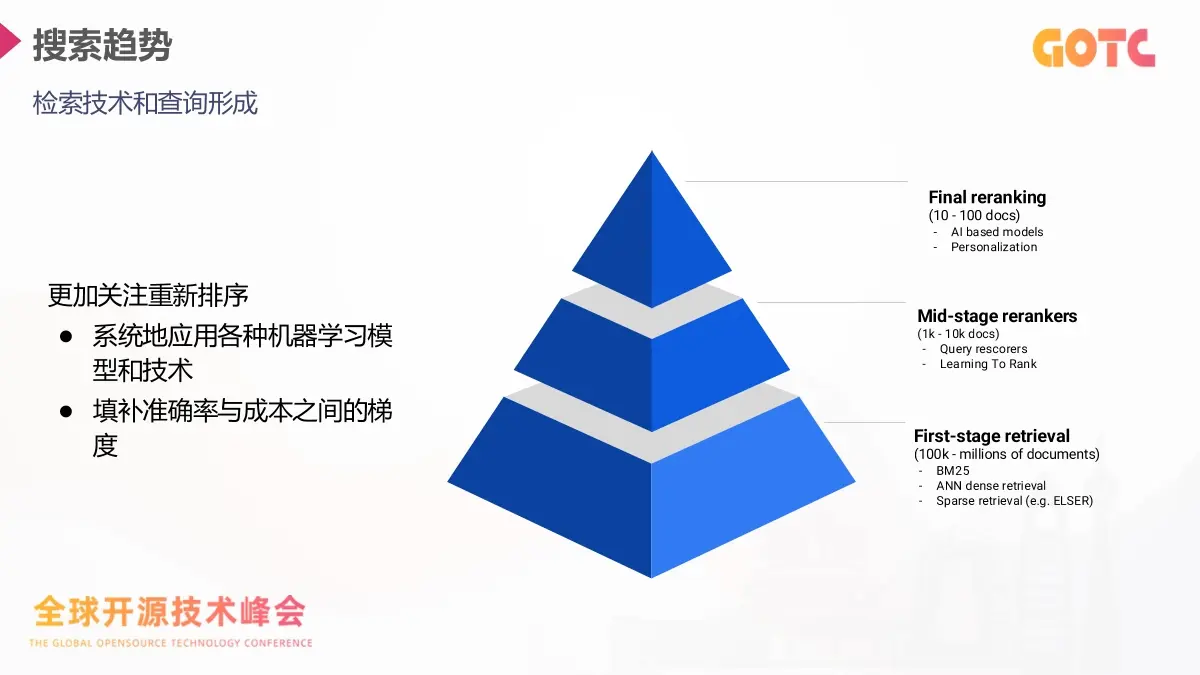 搜索趨勢也在向“重排序優先”的方向演進。分享中展示了從 BM25、ANN、稀疏召回,到 Query Rescorer、LTR,再到 Cohere Rerank、Elastic Reranker 等模型重排的完整路徑。系統先快速縮小候選集,再通過更強的模型提升精度,從而在成本和效果之間取得平衡。