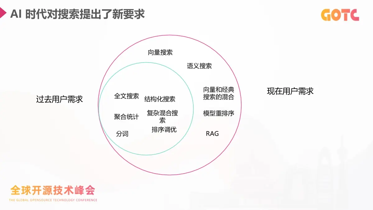 在生成式 AI 已經深入業務的今天,搜索系統的角色正在發生很明顯的變化。用户對搜索的期望不再侷限於關鍵詞匹配,而是希望系統具備語義理解、多模態處理以及實時推理能力。傳統的全文檢索依舊是基礎,但很難覆蓋這些新需求,搜索逐漸成為 AI 應用的核心底座。