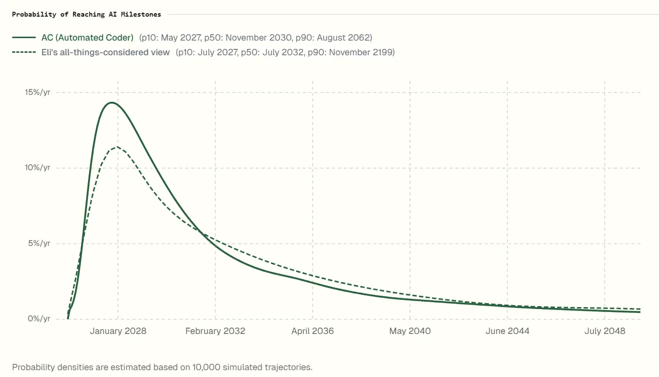 然而,最新的現實反饋讓這位專家變得謹慎。Kokotajlo 在更新後的預測中將 AI 實現自主編程的時間推遲到了2030年代初期,並將超級智能的出現窗口設定在2034年左右。他承認,目前 AI 在複雜現實環境中的表現依然存在“不平衡”現象。