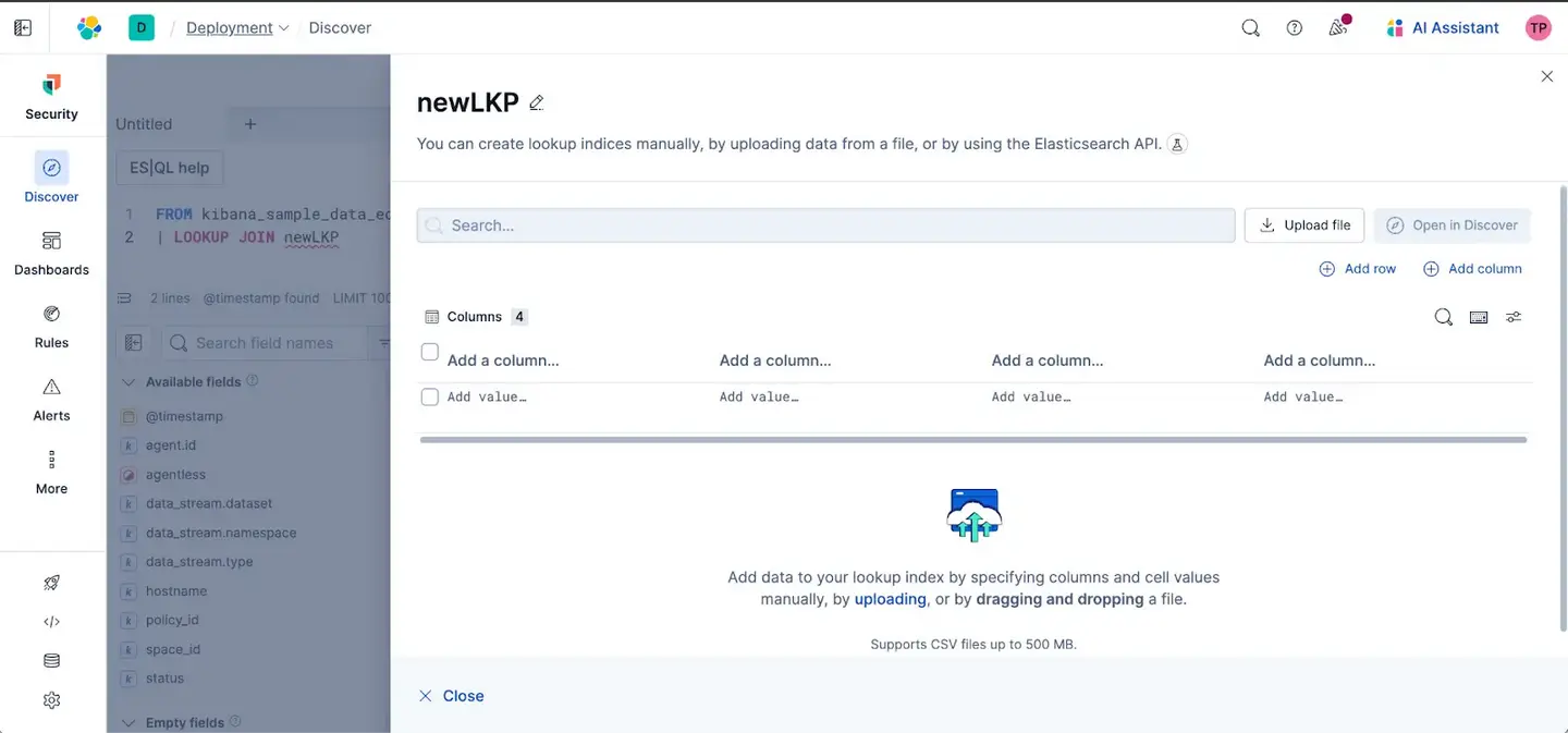 輕鬆文件上傳:現在你可以在 Discover 中直接上傳文件,例如 CSV,並立即在你的 LOOKUP JOIN 中使用。無需再在 Kibana 的不同區域來回切換上下文!