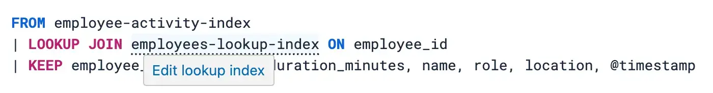 直觀的工作流程:Discover 的完整自動補全會引導你完成整個過程,在 ES | QL 編輯器中建議 lookup 索引和連接字段,讓你輕鬆將上傳的數據與現有索引連接。輸入不存在的 lookup 索引名稱,只需點擊一次即可直接進入 Lookup 編輯器創建索引。輸入已有 lookup 索引名稱,我們會建議編輯選項: