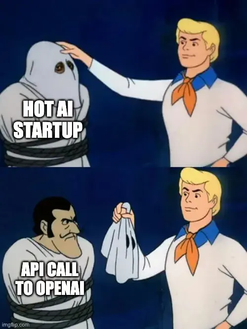 AI 套殼應用梗圖:底層不過是對 OpenAI 的一次 API 調用。