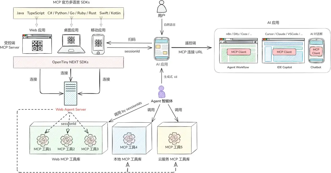 OpenTiny NEXT的核心創新在於構建了前端應用與AI智能體的標準化交互橋樑。通過WebMCP(Web Model Context Protocol)協議,開發者可將企業前端應用的功能封裝為AI智能體可調用的MCP工具,再借助OpenTiny NEXT SDK連接Web Agent Server,讓智能體能夠精準識別用户意圖並自主調用對應功能。相較於傳統RPA方案,該技術在執行效率、準確率和成本控制上均實現質的提升,且完全兼容現有MCP生態,無需改動後端API服務及前端人機交互邏輯,大幅降低改造門檻。