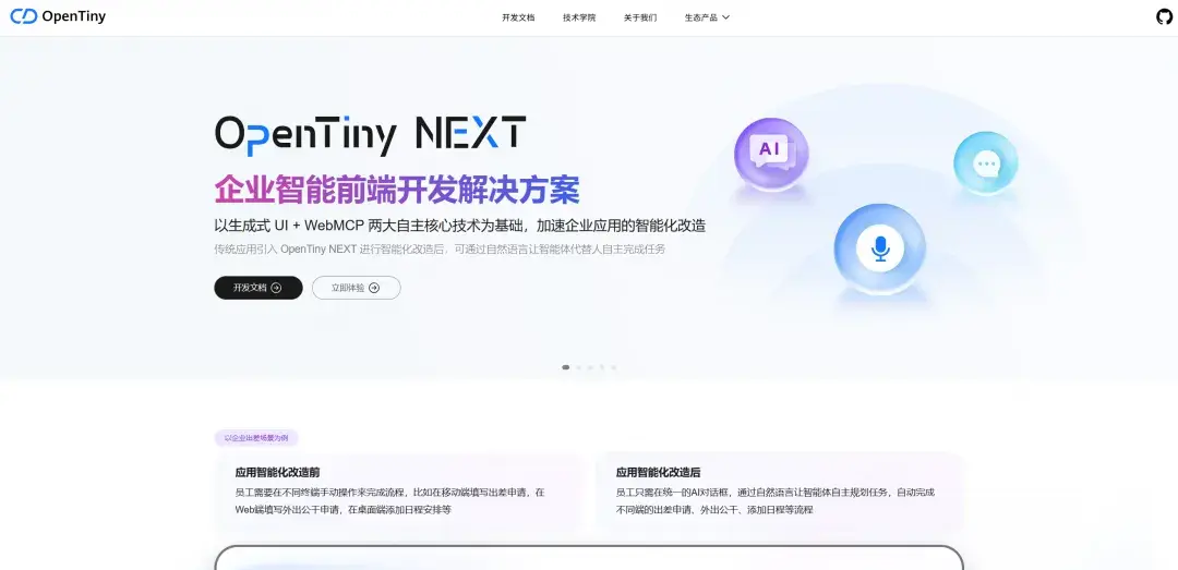 2025年,OpenTiny重磅推出OpenTiny NEXT前端智能化解決方案,以生成式UI + WebMCP兩大技術為核心,革新傳統前端應用的交互模式,實現"自然語言驅動任務自主完成"的智能化升級,為企業應用智能化改造提供了低成本、高效率的落地路徑。