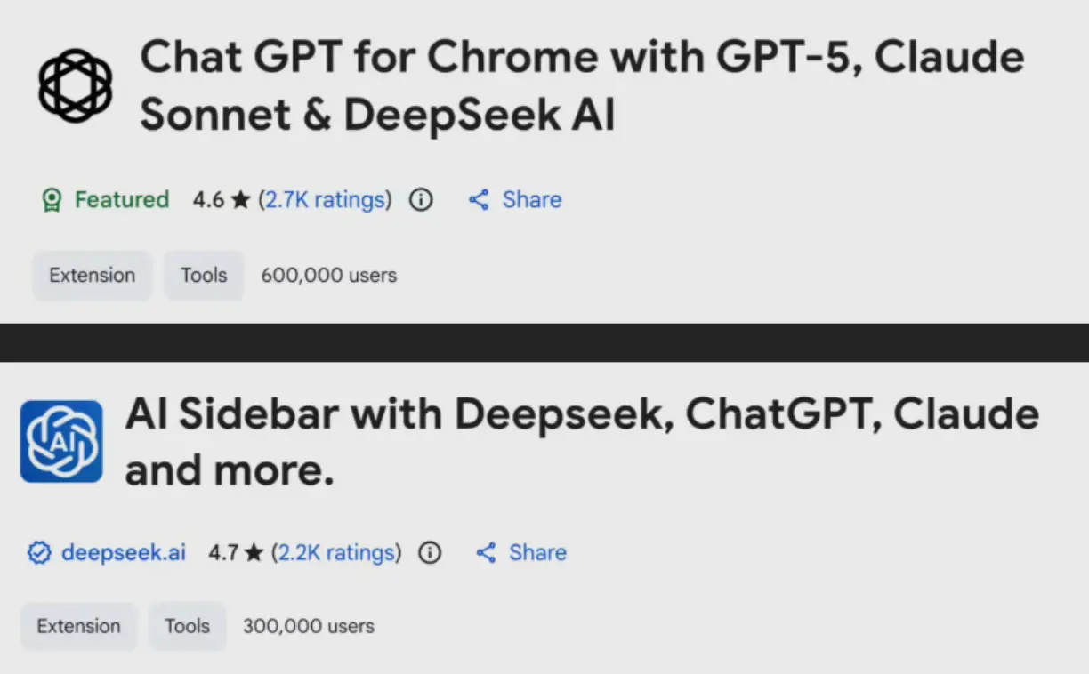 OX Security 安全團隊發佈警告指出,在 Chrome 網上應用店中發現了兩款偽裝成合法 AI 工具的惡意擴展程序,下載量已超過90萬次。專門針對 ChatGPT 和 DeepSeek 等熱門大模型進行數據竊取,目前已被下架。