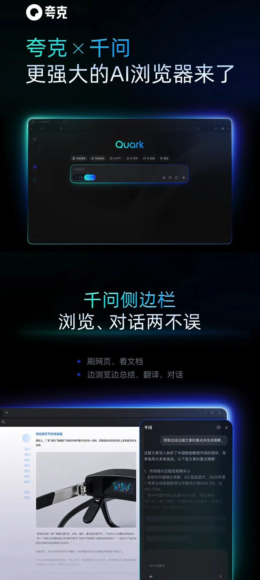 目前,用户在夸克首頁搜索框和側邊欄可直接調用千問,無需切換標籤頁便可完成“邊瀏覽邊對話、邊看邊總結、即問即答”的流暢交互。