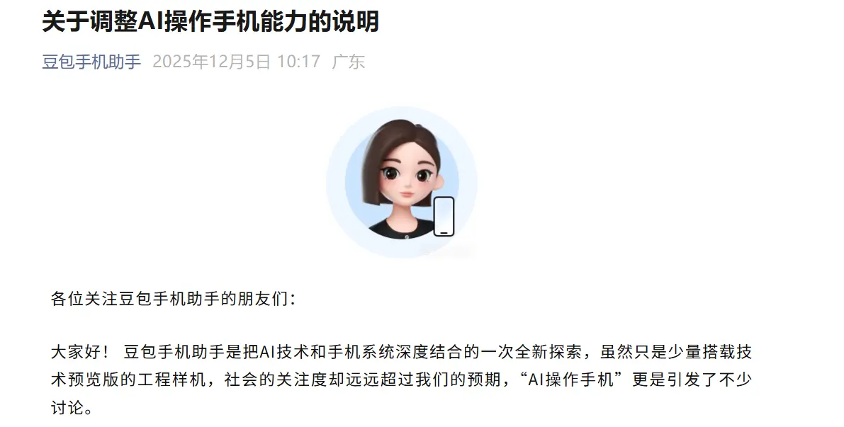 豆包手機助手官方發佈“關於調整AI操作手機能力的説明”表示,由於豆包手機助手社會的關注度卻遠遠超過預期,“AI操作手機”更是引發了不少討論。