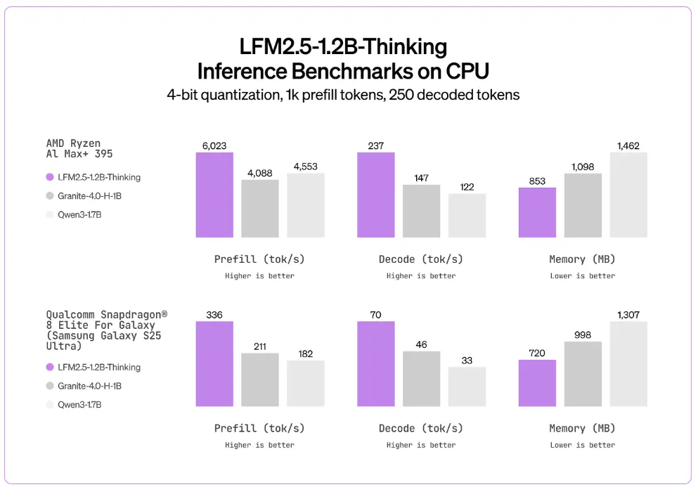 Liquid AI 宣佈推出 LFM2.5-1.2B-Thinking 推理模型,僅佔用手機 900 MB 的內存,卻能提供同等體積下最快的推理速度和最佳的推理質量。