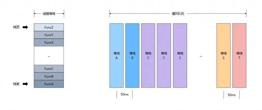 當監控線程監測主線程 RunLoop 時,會獲取主線程的線程快照作為卡頓堆棧。但是,這個主線程堆棧不一定是最耗時的堆棧,也不一定是導致主線程超時的主要原因。為了對這個問題進行優化,需要在檢測到主線程發生卡頓時,通過對保存在循環隊列中的堆棧進行回溯(間隔 50ms 獲取一次),獲取最近最耗時堆棧。