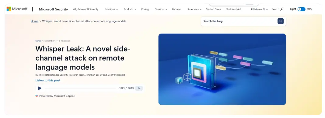 微軟安全研究團隊揭露了一種名為 “Whisper Leak” 的嚴重隱私漏洞。這是一種針對現代 AI 聊天服務的側信道攻擊,可能讓惡意用户窺探到用户與 AI 之間的對話內容。