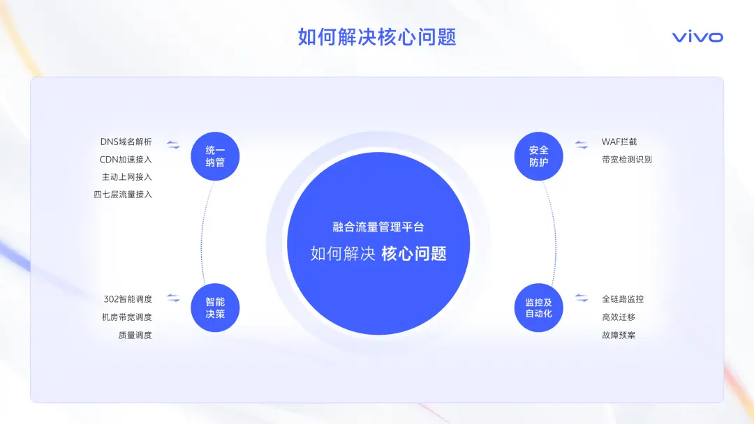 為了實現這些,平台落地為一系列具體的解決方案,比如:通過DNS域名解析、CDN加速接入來統一流量入口;通過302智能調度、機房帶寬調度來實現智能決策;通過WAF攔截、外發流量檢測來保障安全;並通過全鏈路監控和故障預案來實現自動化運維。