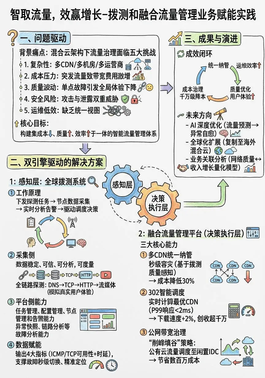 下面這張架構圖展示了我們如何實現這些價值。大家可以看到,我們通過一個“融合CDN管理平台”,把全球主流CDN廠商的API都接入進來,屏蔽了底層的差異。